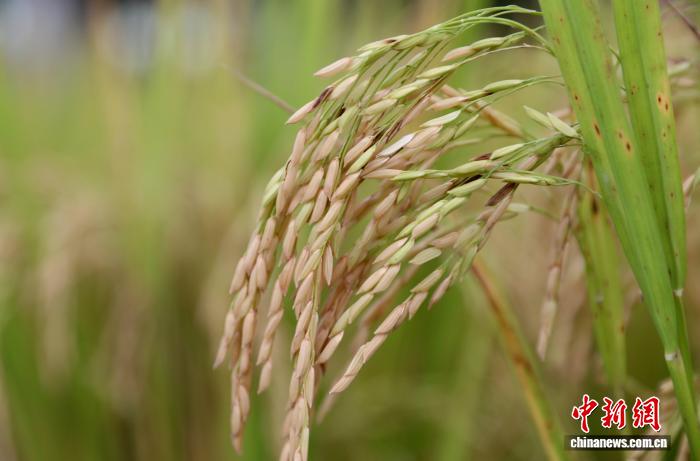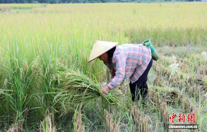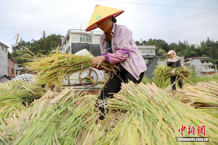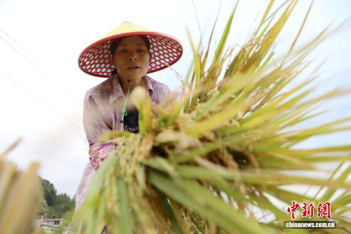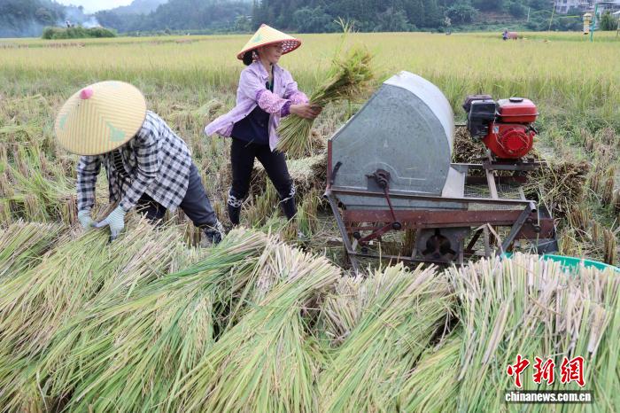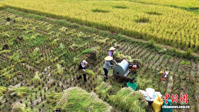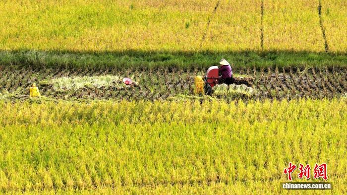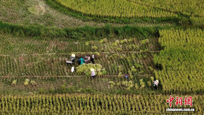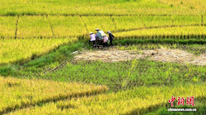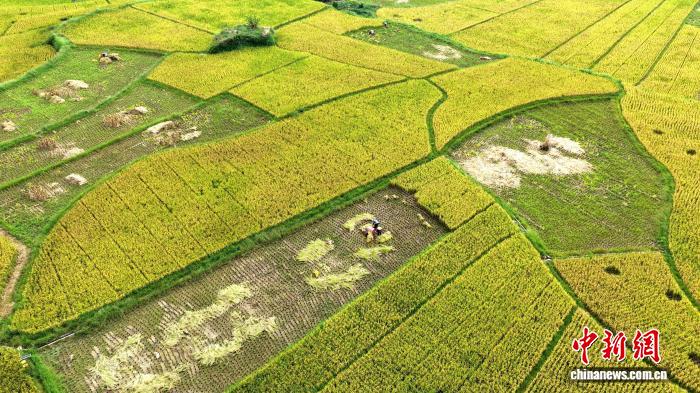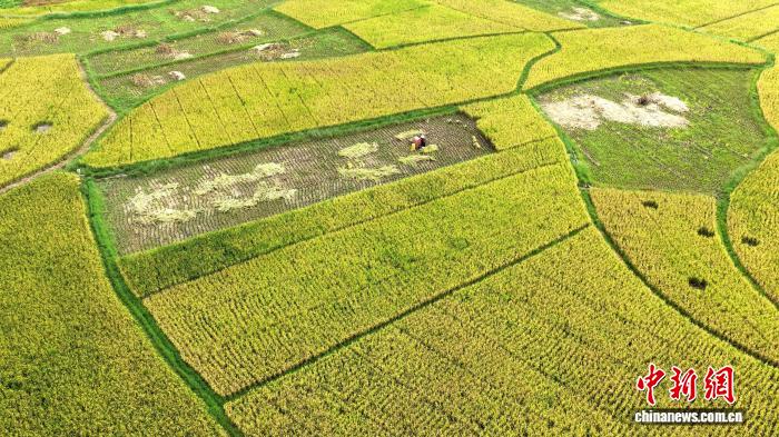 图为航拍村平易近抢支稻谷的劳做场景。龚普康 摄